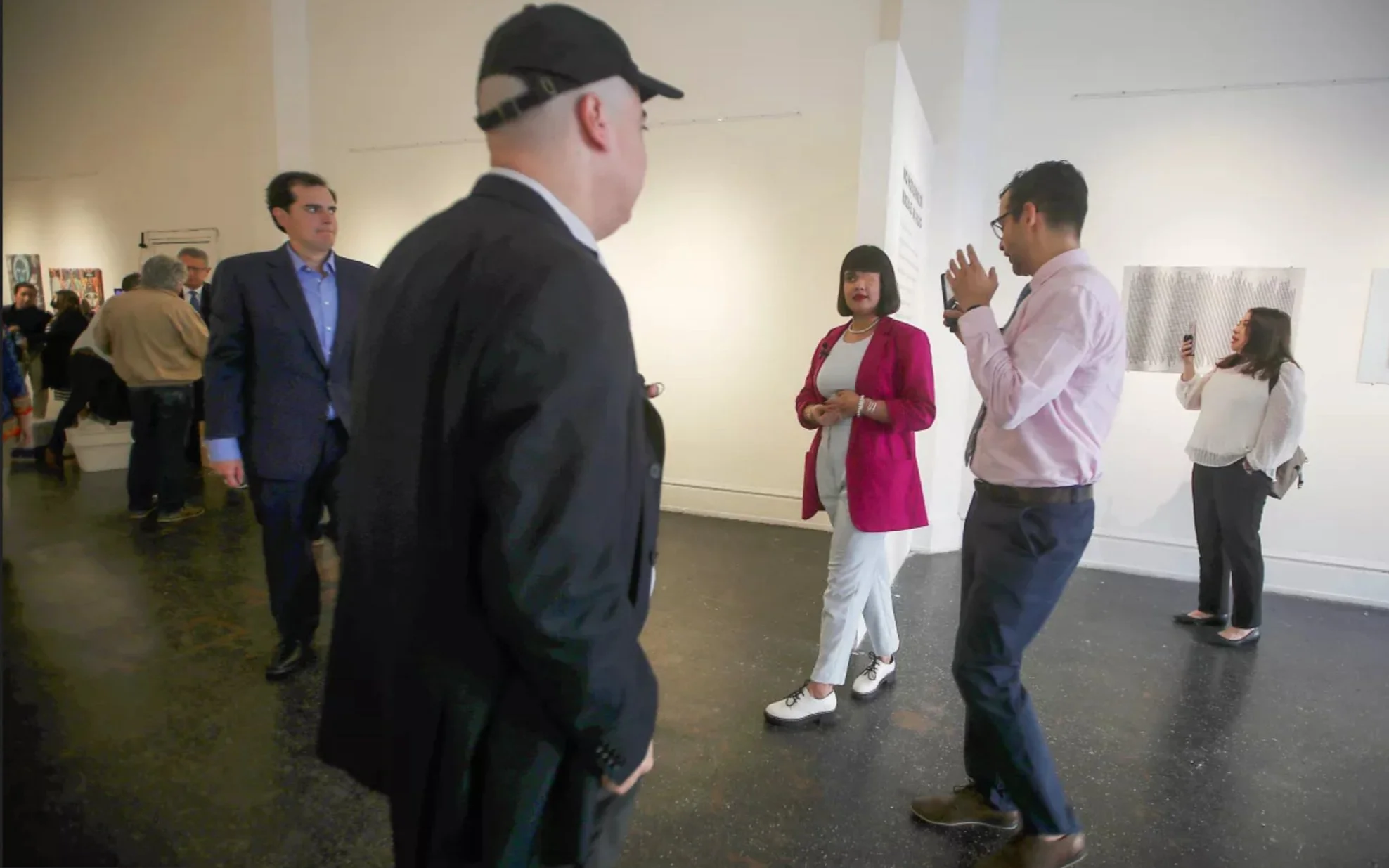 Visitors to the politically themed art exhibit “No Nos Sirve De Nada El Miedo” at the Gloria Delson Gallery in downtown Los Angeles.