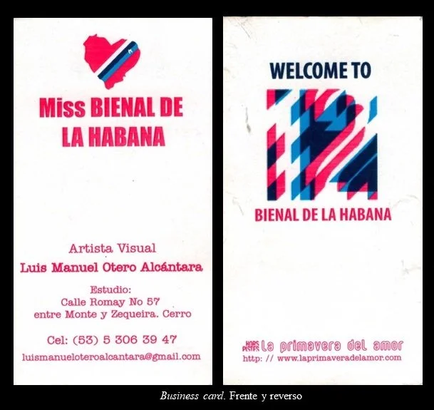 Performance que consistía en travestirme en una bailarina del famoso Cabaret Tropicana e intervenir con esta imagen todos los espacios expositivos de la 12 Bienal de la Habana durante todo su mes. El performance se aprovechaba, en especial, de los días de inauguración, con el objetivo de interactuar con la mayor cantidad de público. Forma parte importante de este gesto la entrega de una tarjeta de presentación donde se aparecían mis datos personales junto al título de Miss Bienal de la Habana, título que hacía referencia al carácter mismo de esta.